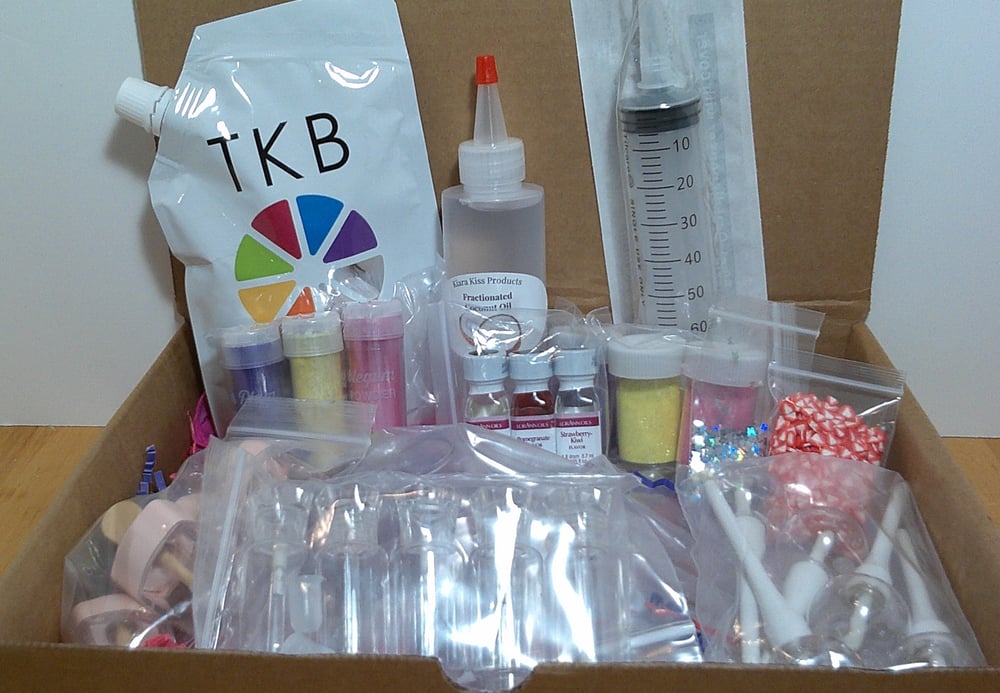 Lolipops (5) candies (5) ice cream (4) shaped tubes. Included in this candy themed lipgloss making kit, fractionated coconut oil, 3 flavor oils, 3 mica powders with 3 matching glitters, 60 ml syringe, strawberry fimo fruit, holographic butterflies glitter, bowl and spoon, a pair of gloves